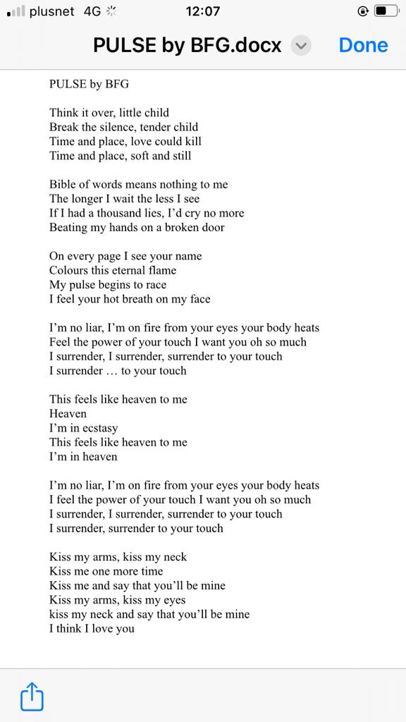 [Ed. Note- rex spent some time listening and typing the lyrics for the song. Special thanks to Lisa Dunn, Mike Simkins and B.J. Williams of BFG for filing in the blanks.]Actually, here they are, sent directly through me by the band later!
