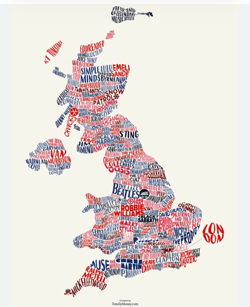 Take a close look at the clever map of the UK above with British musicians’ names located near their hometowns.